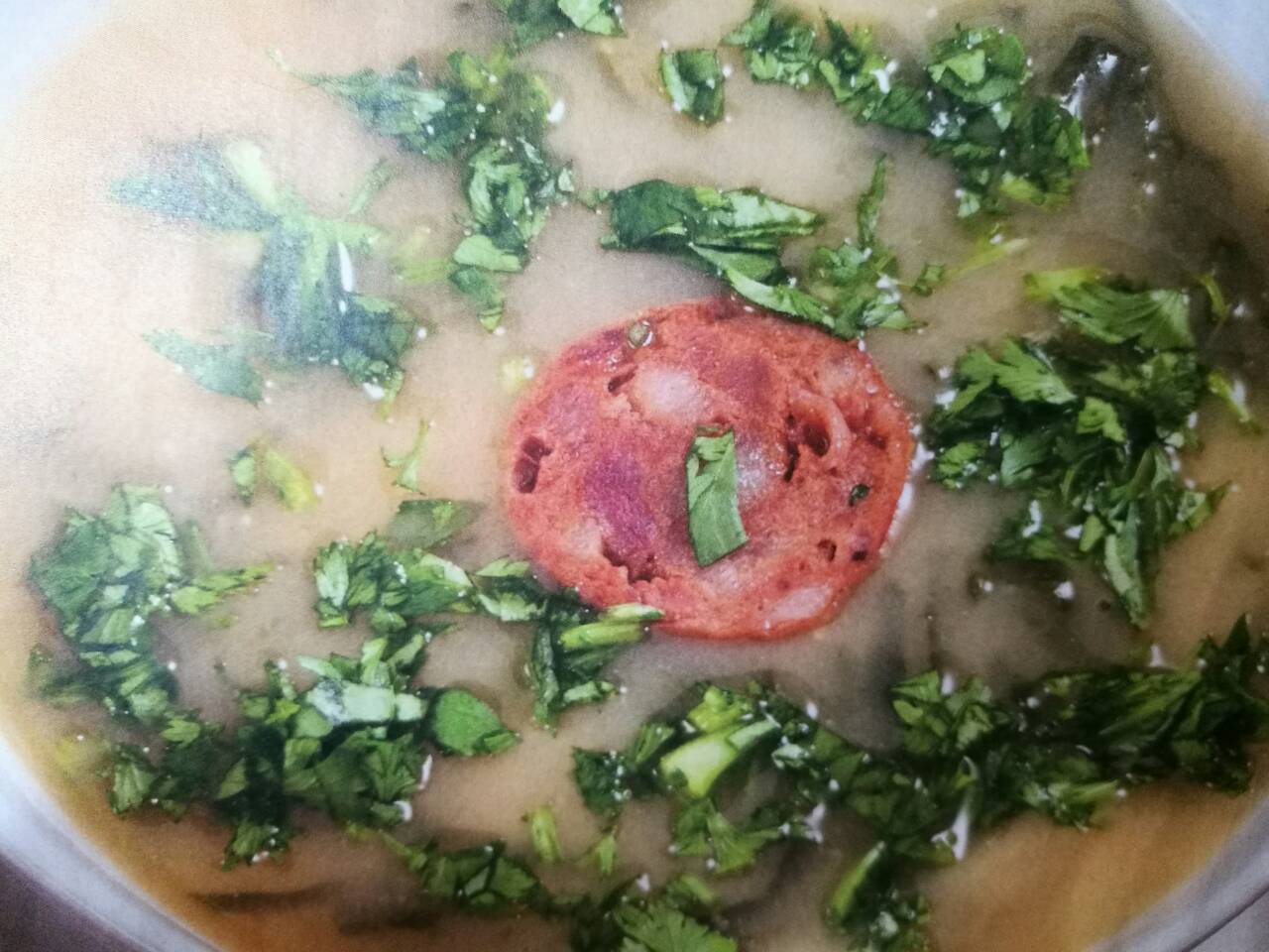 </p><p>Quando levantar fervura, misture a couve bem lavada e deixe cozer por mais dez minutos. No final, retifique temperos e sirva a sopa bem quente, com as rodelas de chouriço e polvilhada com coentros picados.</p>