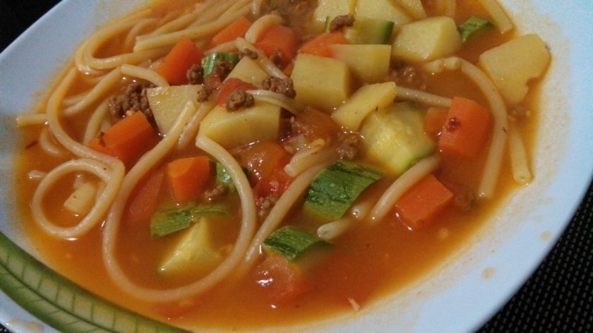 </p><p>Leve o caldo ao lume, assim que ferver, junte a carne, o esparguete partido em pedaços pequenos, as batatas e o tomate em cubos, cozinhe durante 8 minutos. Junte a curgete em cubos, o grão, a abóbora e cozinhe mais 10 minutos.