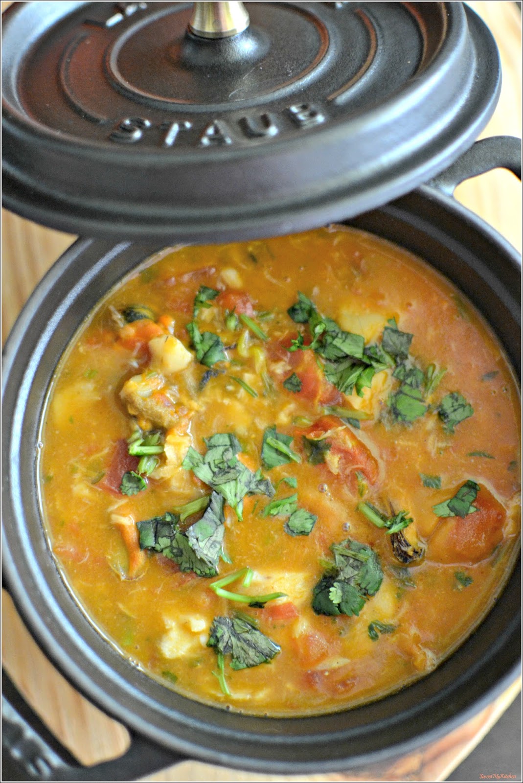 </p><p>Adicione o peixe limpo de espinhas. Fora do lume, junte os camarões e as ervas aromáticas picadas. Sirva com Pao frito.</p>