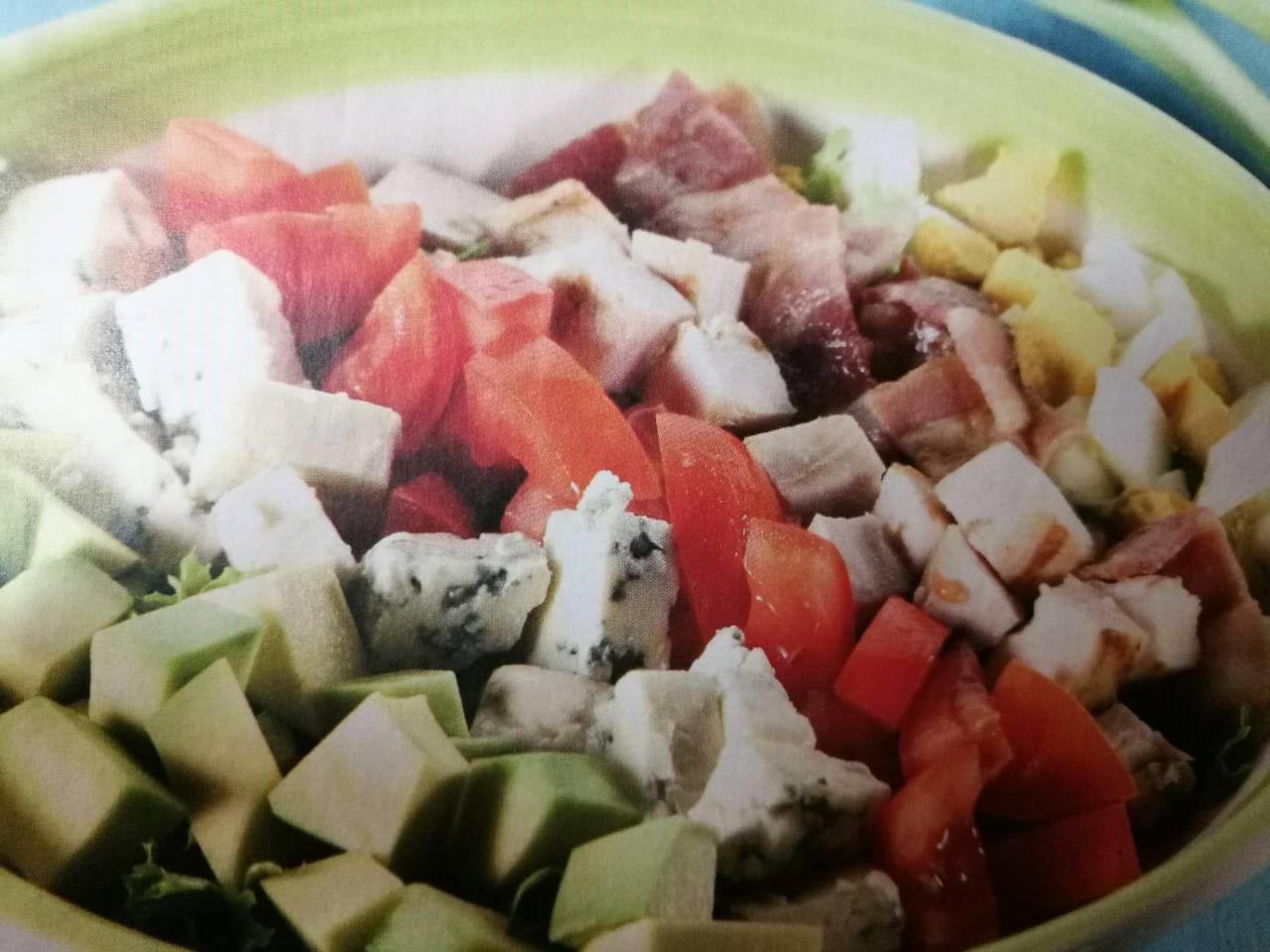 </p><p>Coloque as folhas de alface numa saladeira e disponha os ingredientes lado a lado e em fila, por cima. Para o molho: Misture a maionese com vinagre, o endro, sal e alho em pó. Envolva as natas e disponha este molho sobre a salda. Sirva de Imediato.</p>