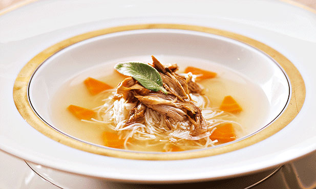 </p><p>Junte também o arroz e deixe cozer. Quando faltar um pouco para o final da cozedura, adicione o vinagre. Transfira a canja para uma terrina e decore com folhinhas de hortelã.