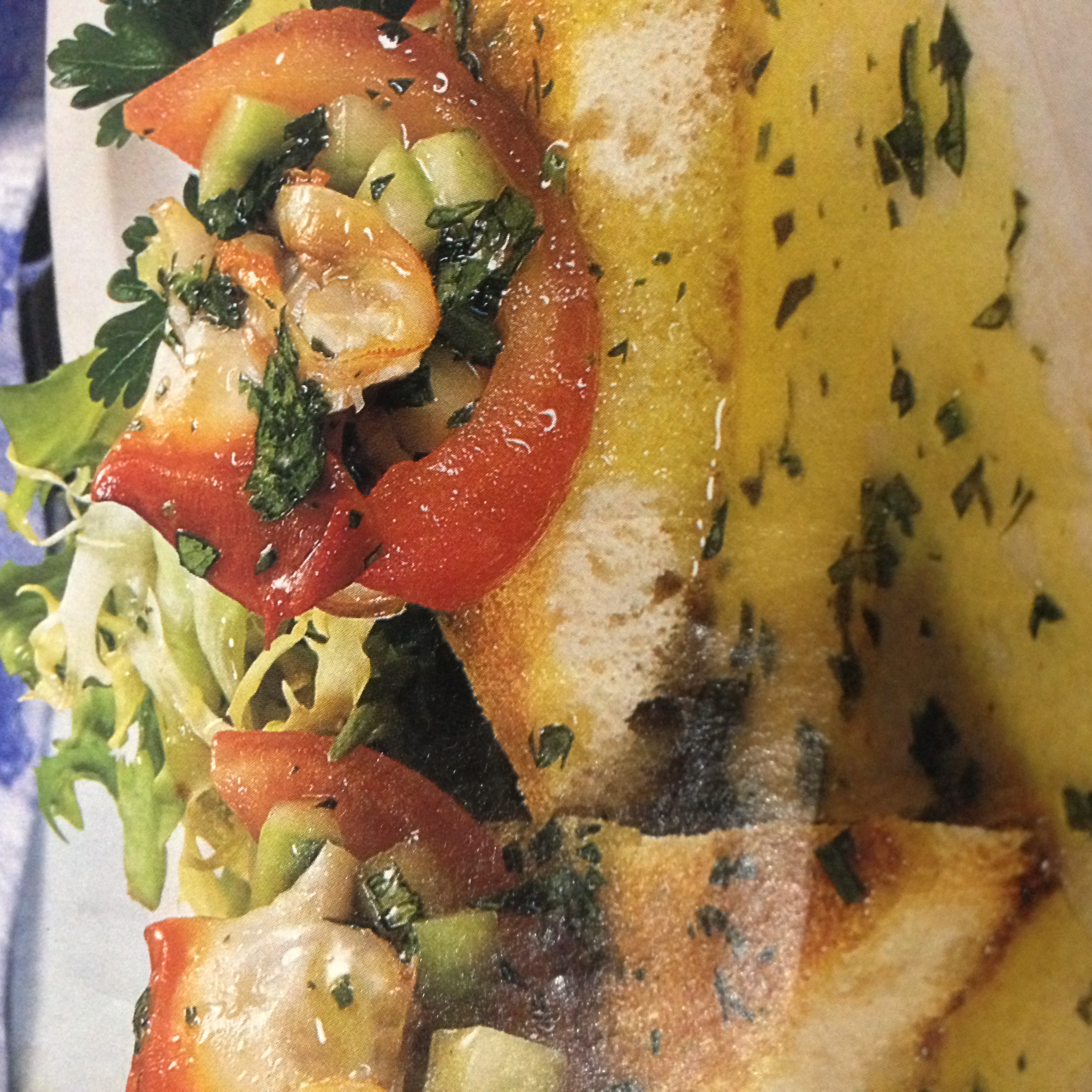 </p><p>Numa tigela, coloque as amêijoas, o pepino e os restantes alhos picados e tempere. Torre os triângulos de pão e sobreponha-lhes os gomos de tomate.