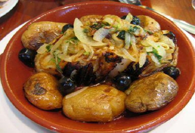 </p><p>Depois de tudo assado, coloque o bacalhau e as batatas num prato e disponha, por cima a cebola às rodelas.