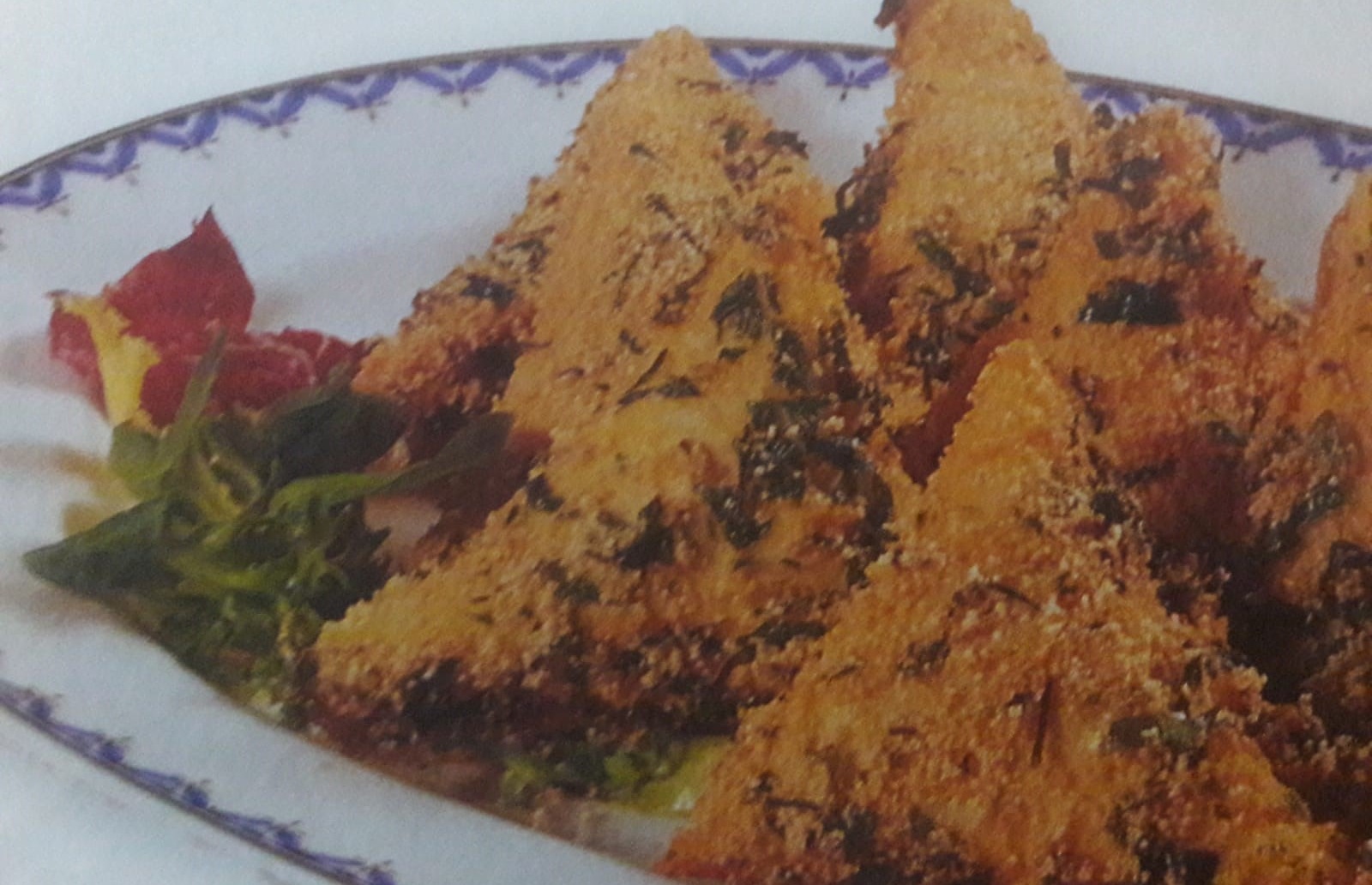 </p><p>Passe as chamuças pelos ovos batidos e pão ralado misturado com salsa picada e frite-as em óleo quente.
