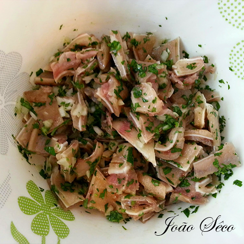 Quando cozinhada, retire da agua e seque bem . Grelhe a orelha inteira e corte em bocados pequenos. envolva-a em azeite, vinagre, a cebola e os alhos picados. adicione por fim os coentros picados e os pickles.