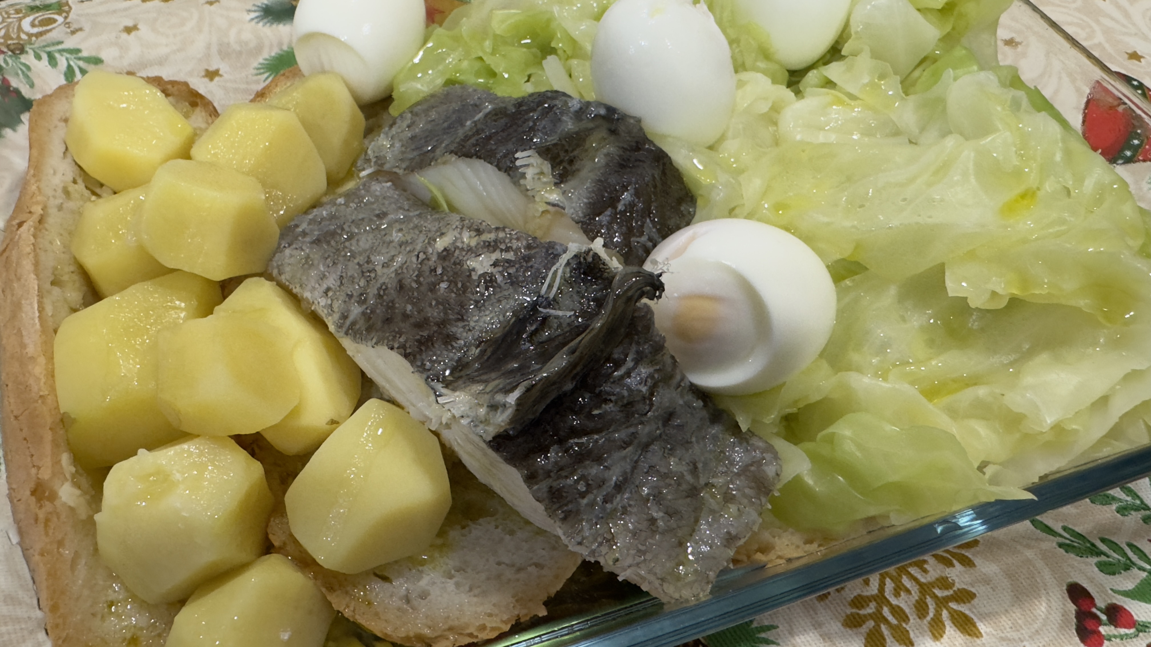 Em seguida, disponha sobre o pão, o bacalhau, as batatas, as couves e os ovos.