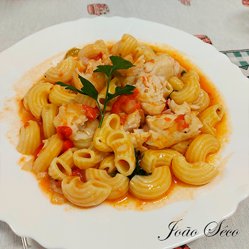 Adicione depois o tomate picado com o molho, deixe ferver, junte os pedaços de peixe e deixe cozinhar durante 5 minutos. Retire com cuidado os pedaços de peixe e reserve-os. Junte ao tacho o pimento cortado em tiras , sem as peles brancas e as pevides, adicione tambem 1,5L de água quente e deixe ferver. Rectifique o sal e a pimenta , junte a massa , mexa até ferver e deixe cozihar durante 8 minutos.