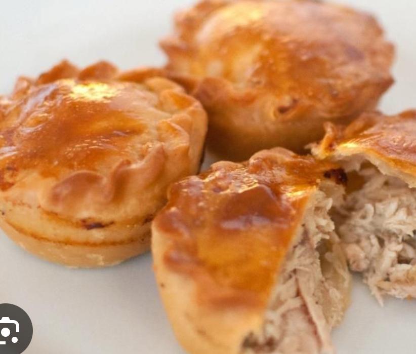 Empadas de massa folhada com recheio de galinha, carne de porco e toucinho.