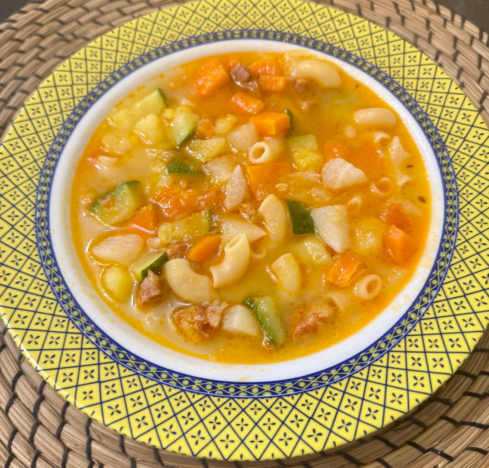 - Ao fim deste tempo, junte o nabo e as batatas, cortados em cubinhos, e deixe cozinhar durante mais dez minutos. Acrescente, então, a curgete também em cubinhos e a massa. Deixe cozinhar mais dez minutos em lume brando. Retifique os temperos, se necessário, e sirva.