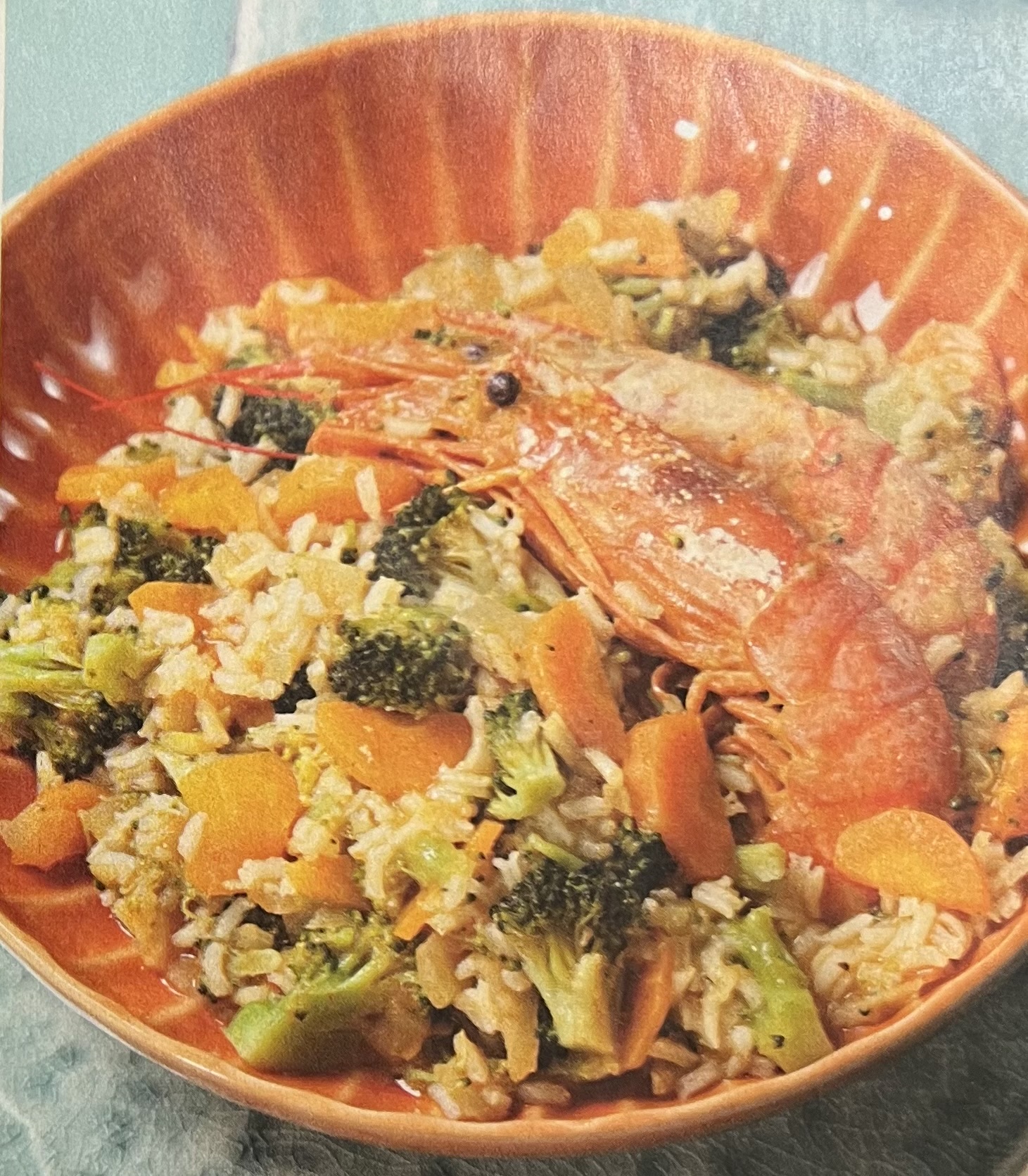 - Corte a cenoura às rodelas finas e junte-as ao refogado, assim como o arroz. Deixe fritar um pouco e acrescente os brócolos em pedacinhos e a água. Tempere com sal e pimenta; deixe cozer, em lume brando, por dez minutos. Retire o arroz e sirva-o com as gambas.