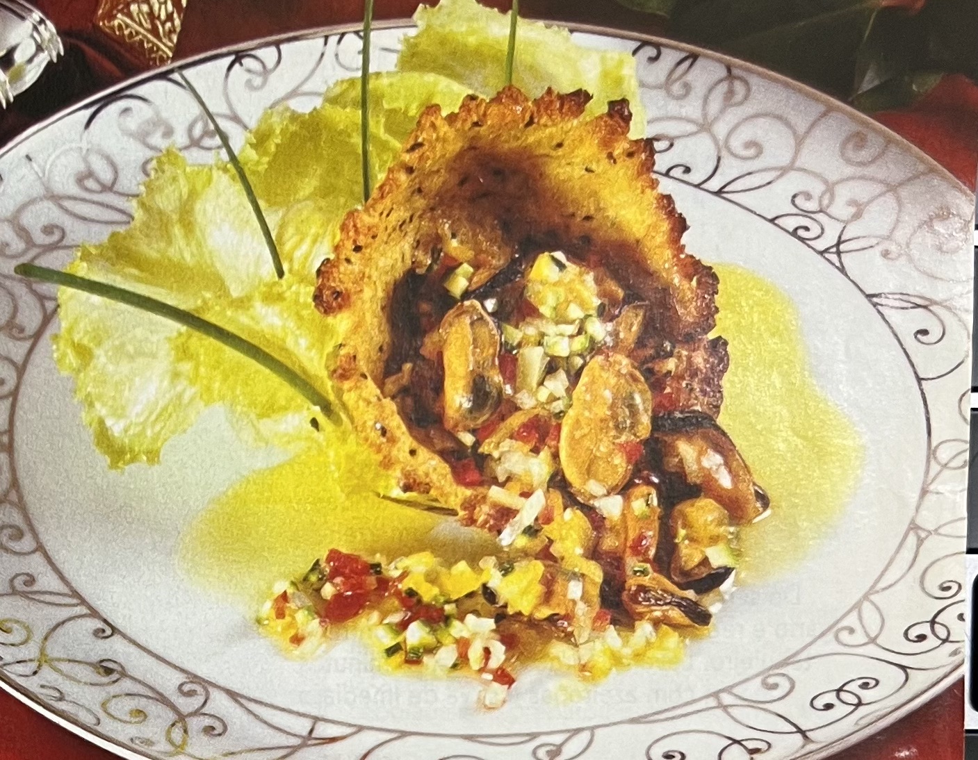 - Recheie os cestinhos com o vinagrete de mexilhão e emprate. Regue com o molho e decore com folhinhas de alface e cebolinho.