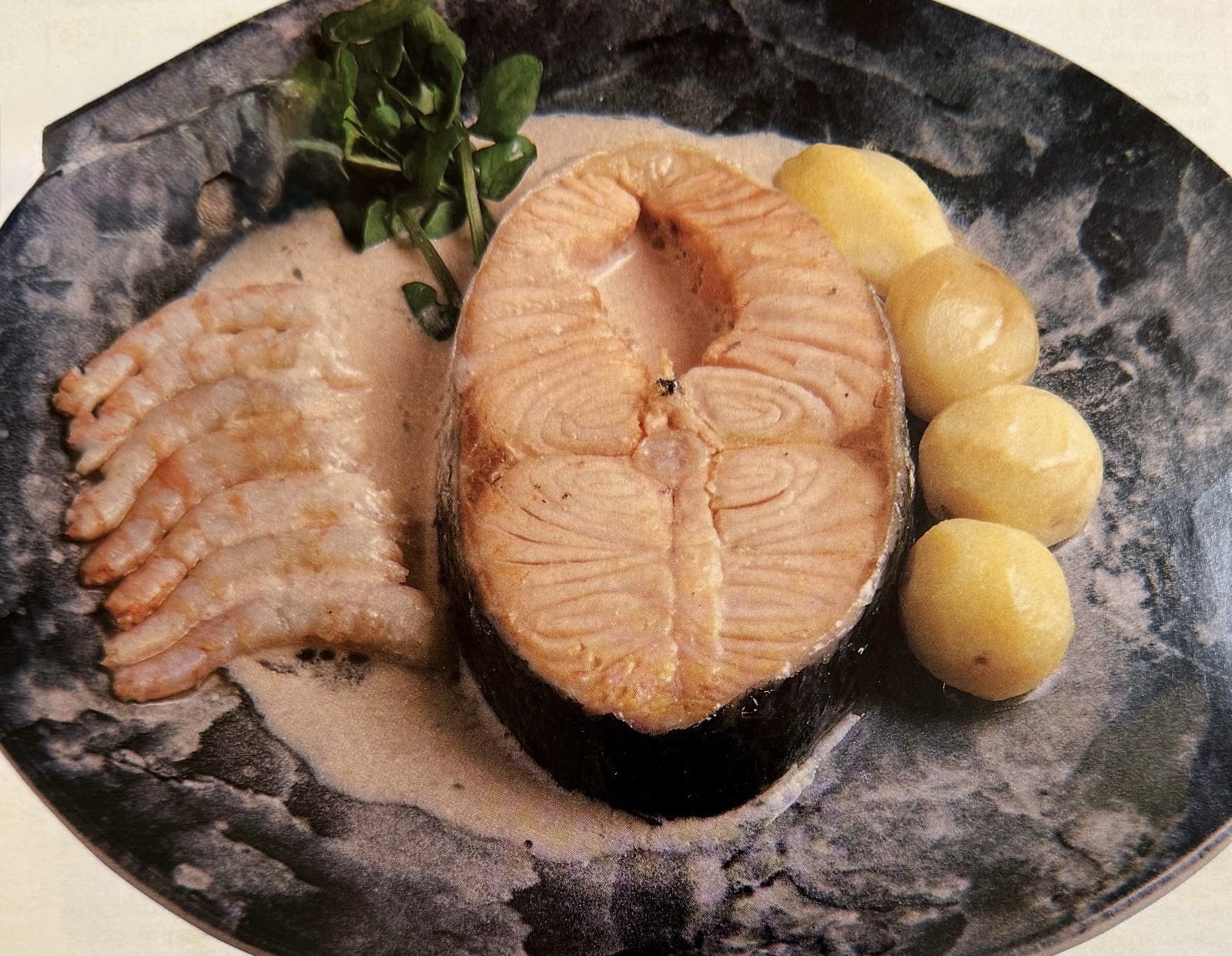 - Põe-se o salmão numa travessa de servir quente, cobre-se com o molho e acompanha-se com gambas e batatas cozinhadas em vapor.