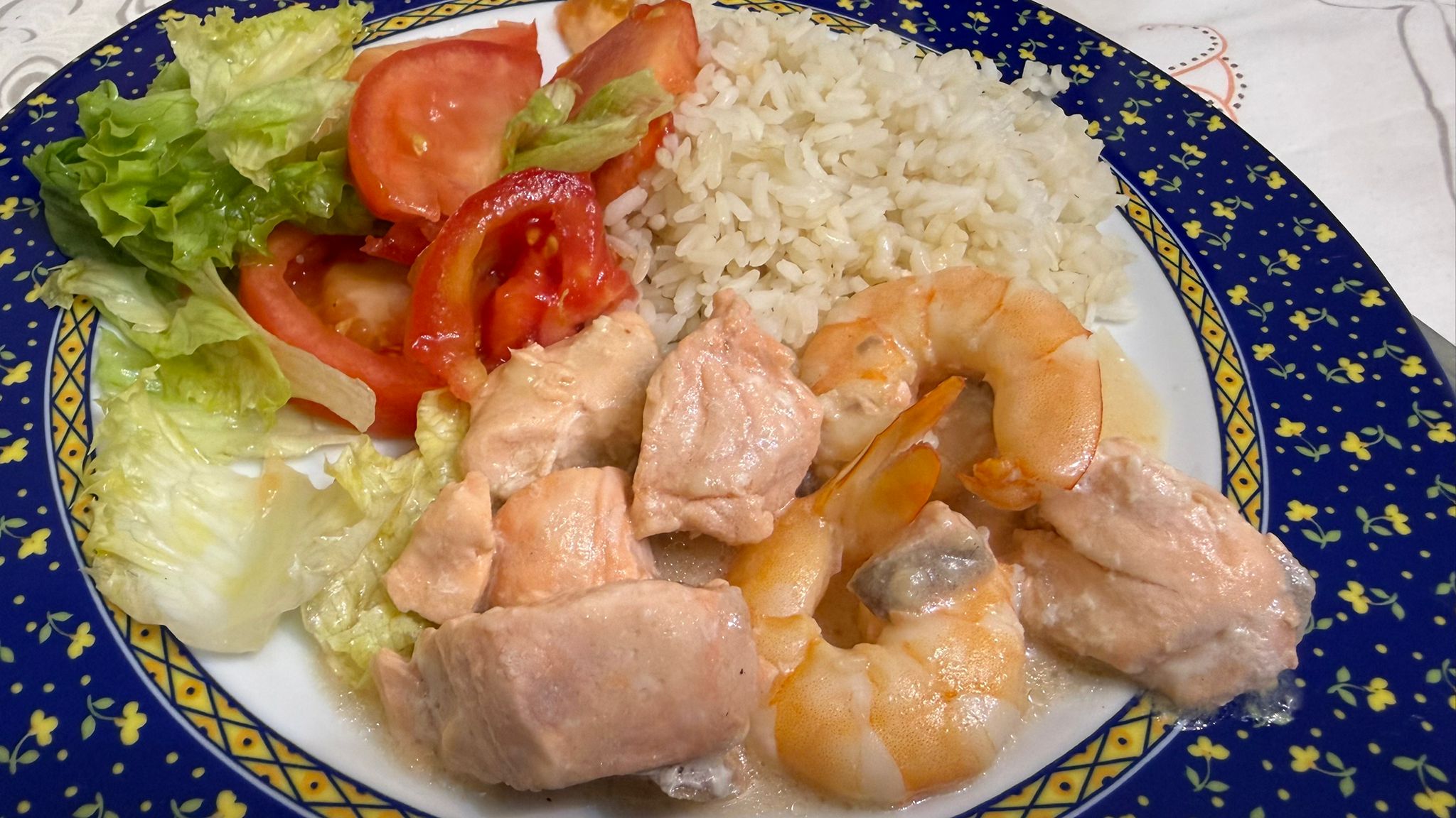 - Leve ao lume, num recipiente largo, o vinho branco com 1,5 dl de água e tempere com sal; quando ferver, junte o salmão e os camarões descascados em cru e deixe ferverem 1 minuto. Escorra-os depois aproveitando o caldo.