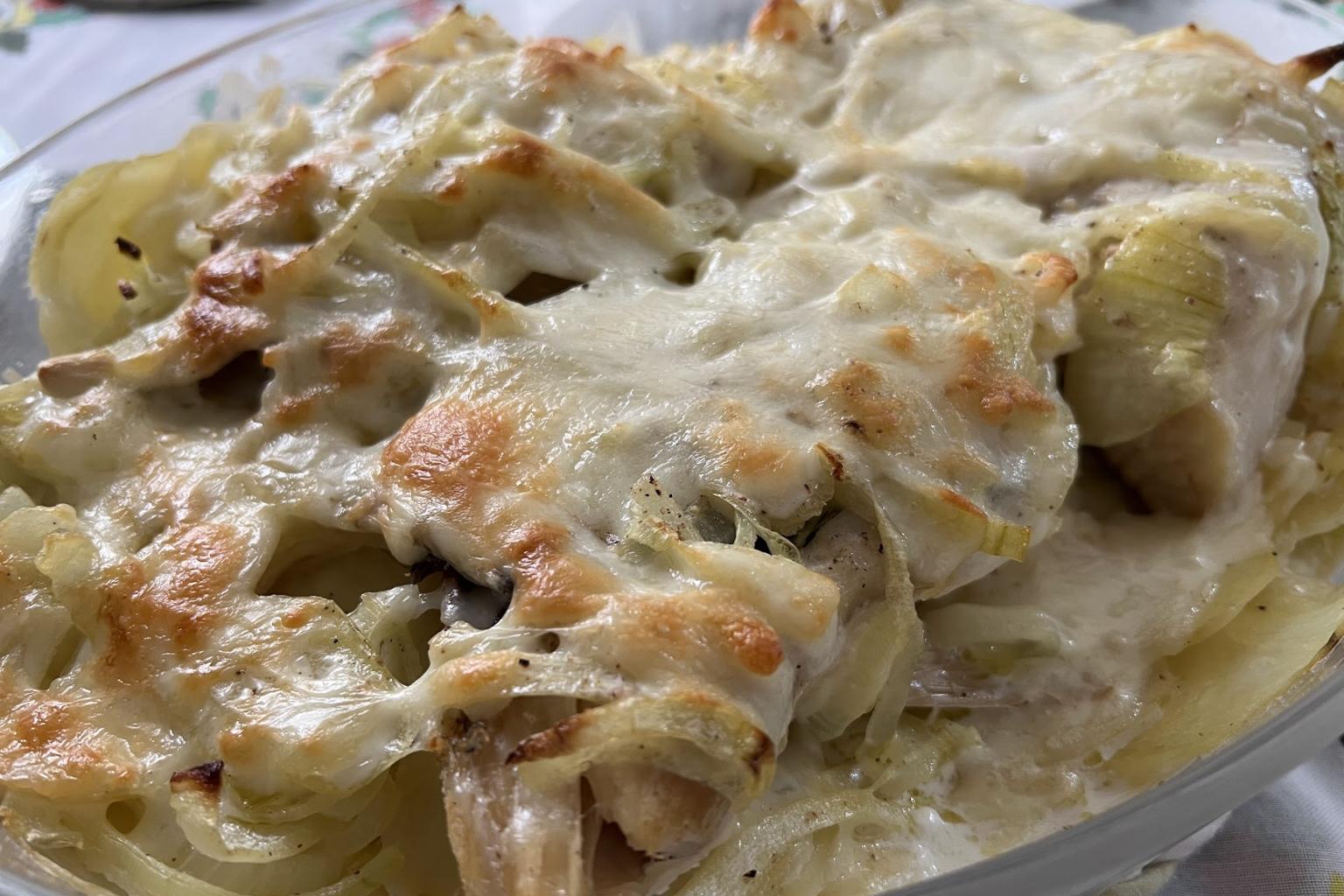 - Em um refratário, disponha as rodelas de batatas no fundo e, por cima, as postas de bacalhau.