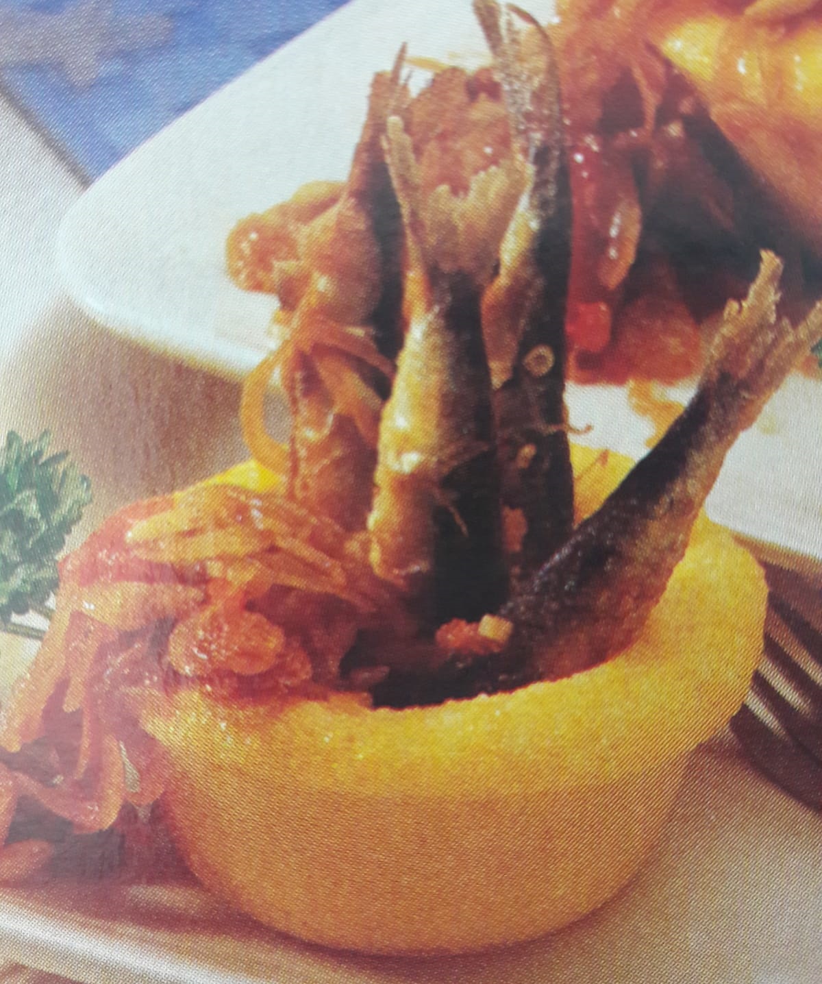 </p><p>Desenforme a polenta e sirva com as sardinhas, decorando a gosto.</p>
