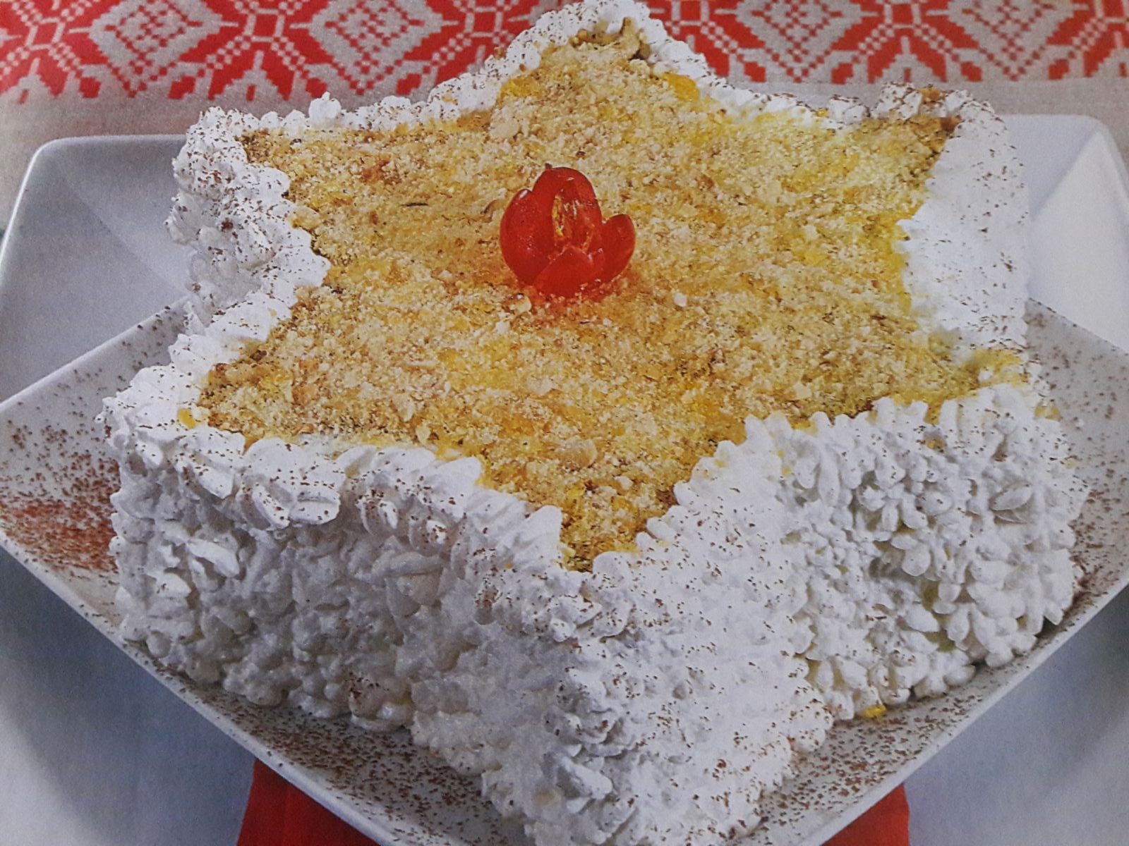 </p><p>Retire, desenforme e deixe arrefecer. Faça a decoração: Bata as natas com o açúcar e barre as partes laterais do bolo.