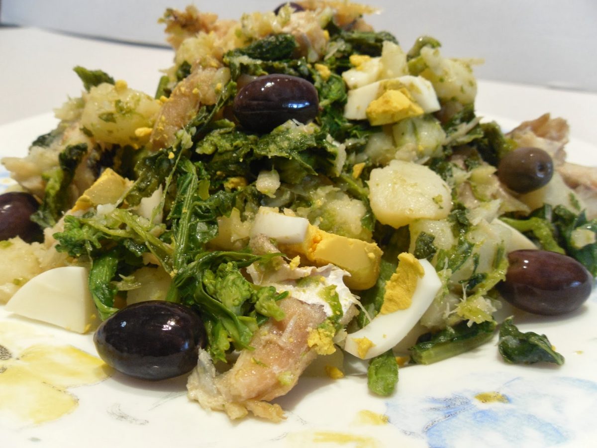 </p><p>Mexa bem e cozinhe, para apurar, em lume brando. Acrescente os ovos e deixe apurar mais um pouco. Quando estiver pronto , junte duas gotinhas de vinagre tinto e envolva tudo novamente. Disponha numa travessa e , por cima , coloque rodelas de ovo. </p>