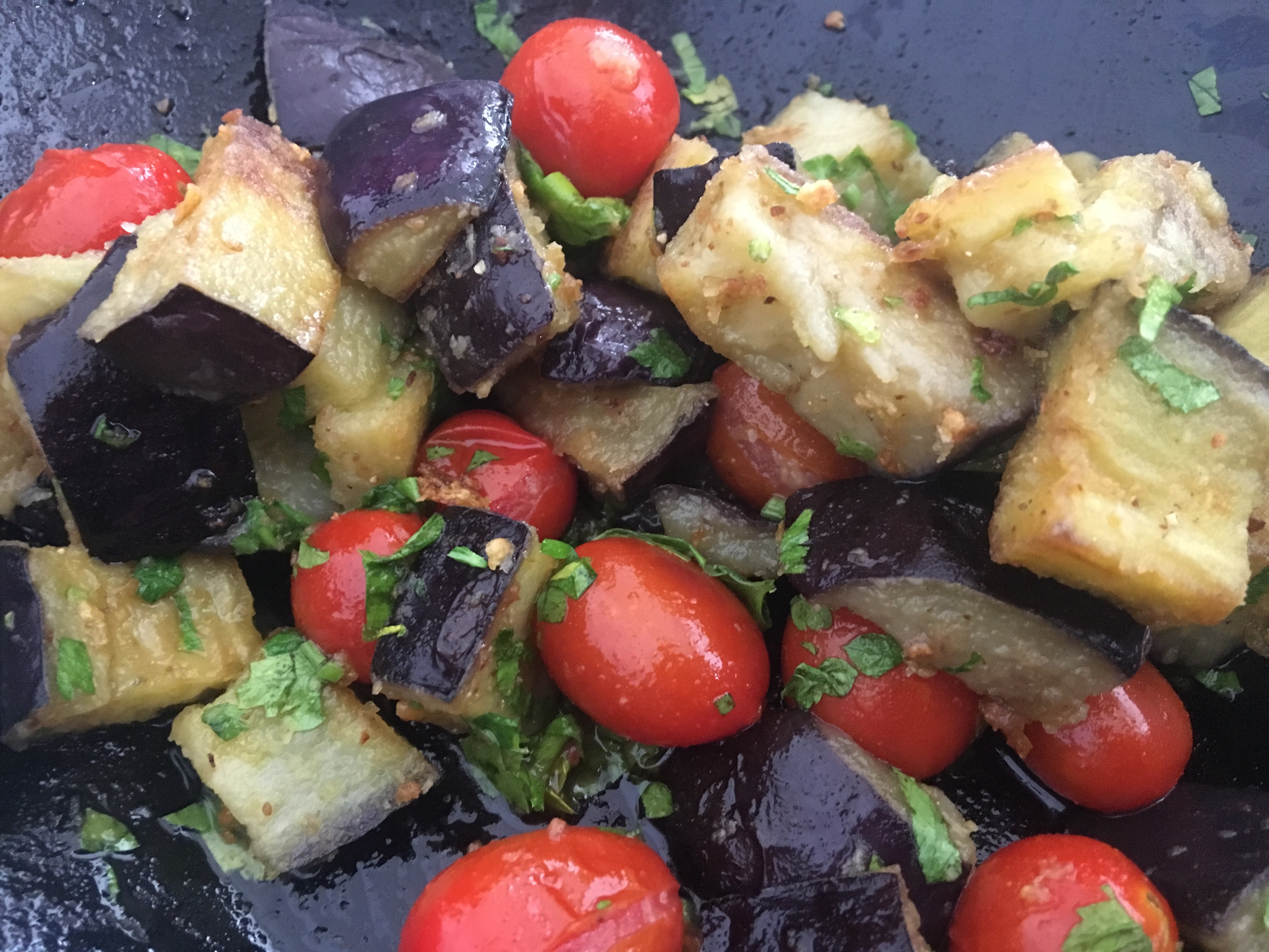 </p><p>Lave muito bem os tomates, tempere com sal e pimenta e leve a fritar no mesmo azeite, junte os a beringela, polvilhe com os alhos e a salsa muito bem picadinhos, misture tudo com cuidado e sirva.</p>