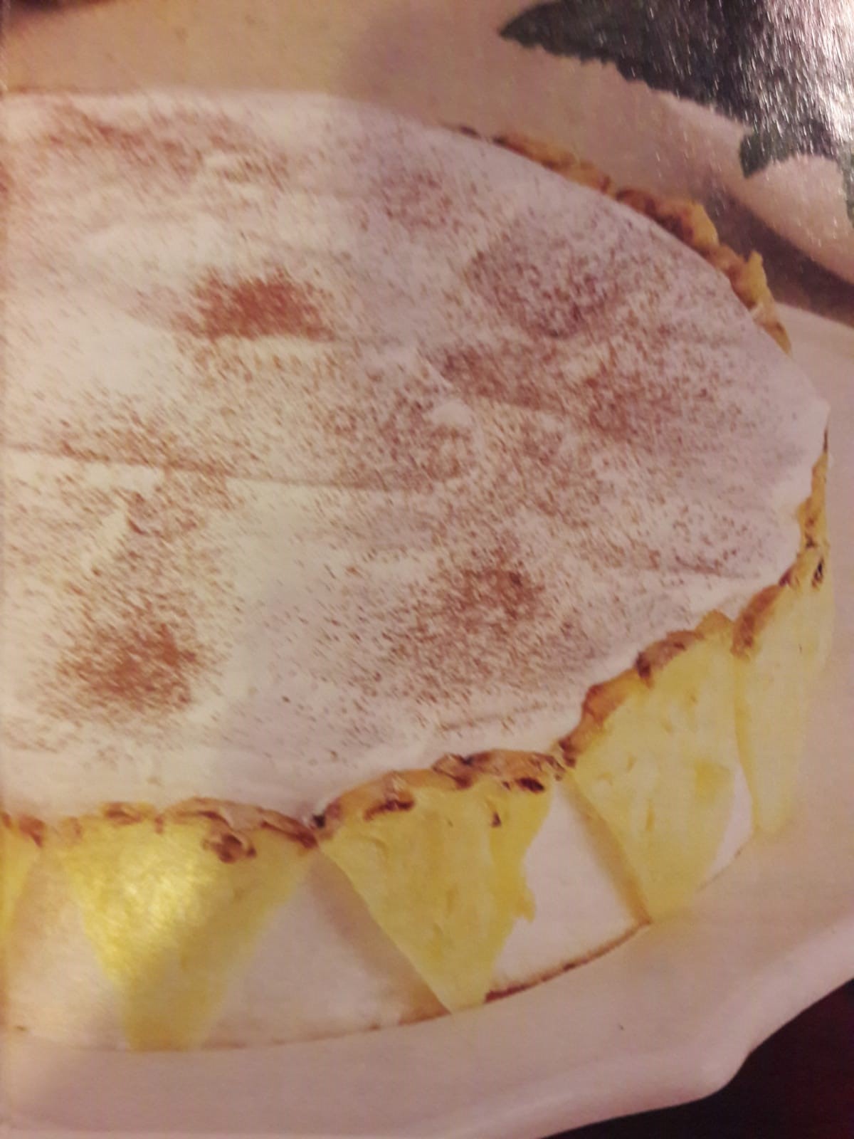 </p><p>Corte em triângulos, as rodelas de ananás, com a casca e disponha-as à volta do bolo.