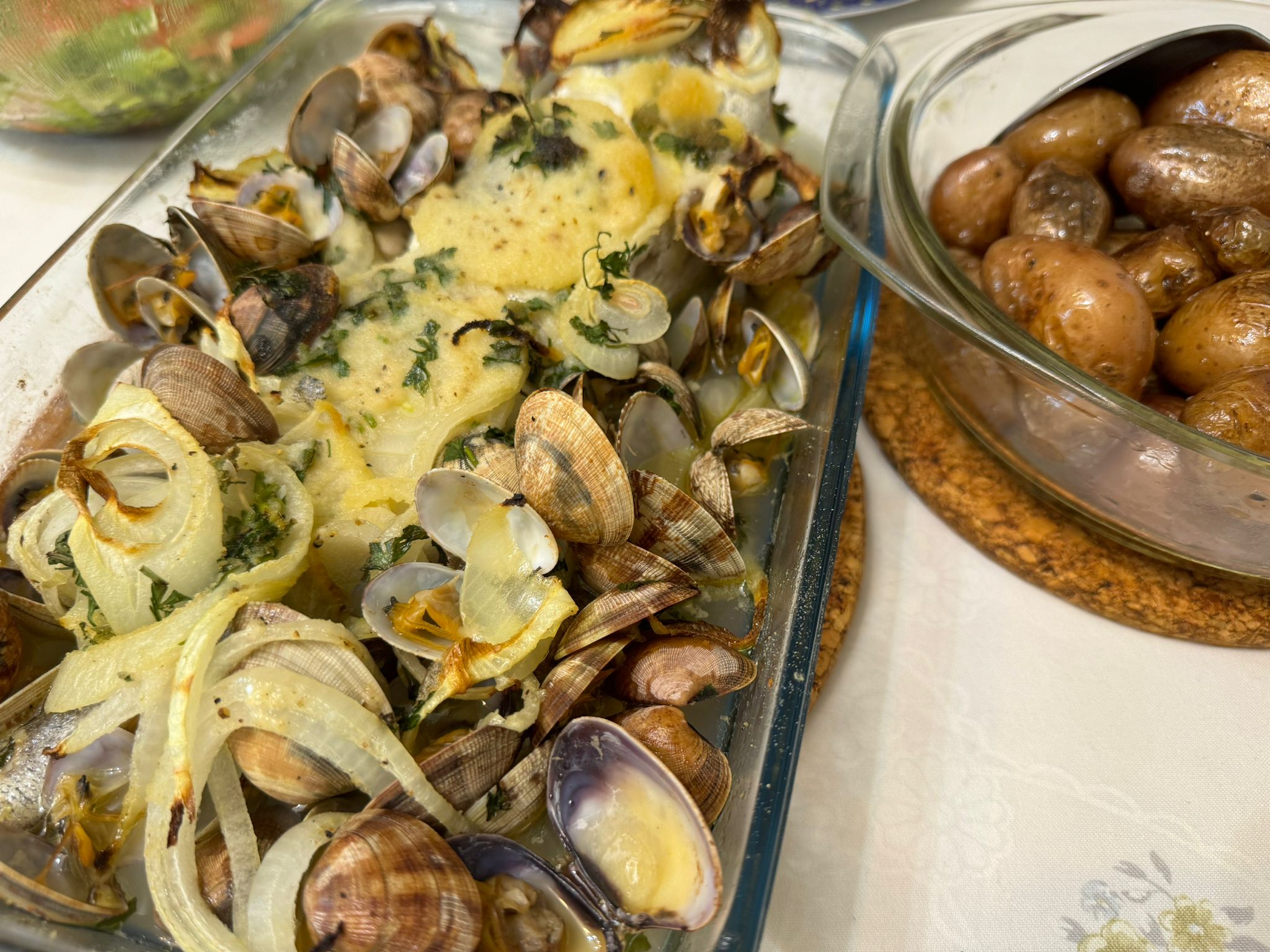 Pescada gratinada no forno com amêijoas.