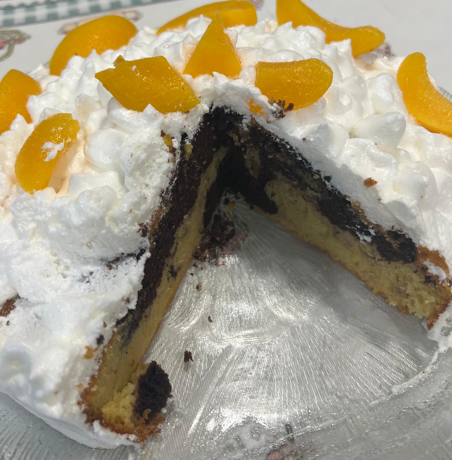 - Desenforme o bolo e depois de frio barre a superfície do bolo com merengue. Por cima, disponha meios pêssegos e decore com restante merengue passado por um saco de pasteleiro, munido de um bico canelado.