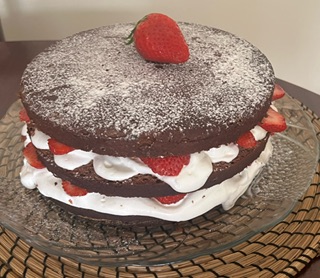 Bolo de chocolate com chantilly e morangos