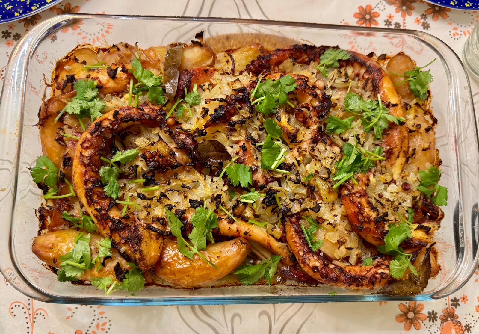 Polvo no forno com batatinhas regado com azeite.