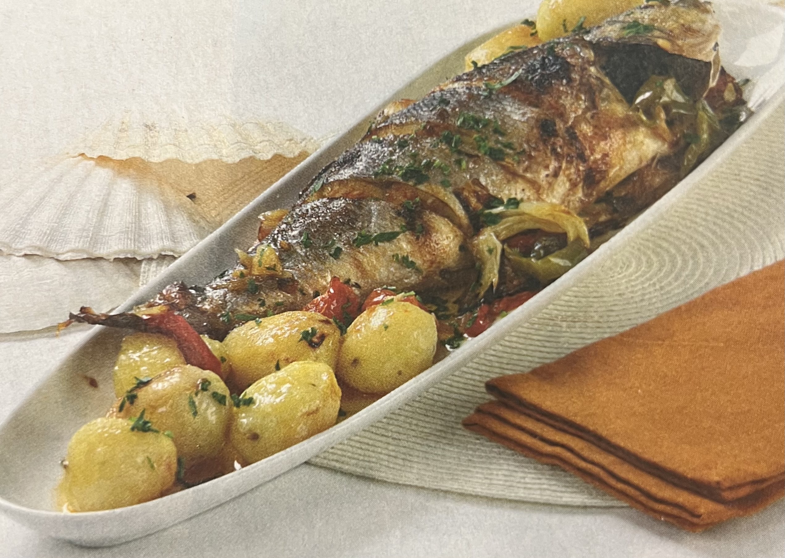 Robalo no forno com batatinhas em cama de tomate e pimento
