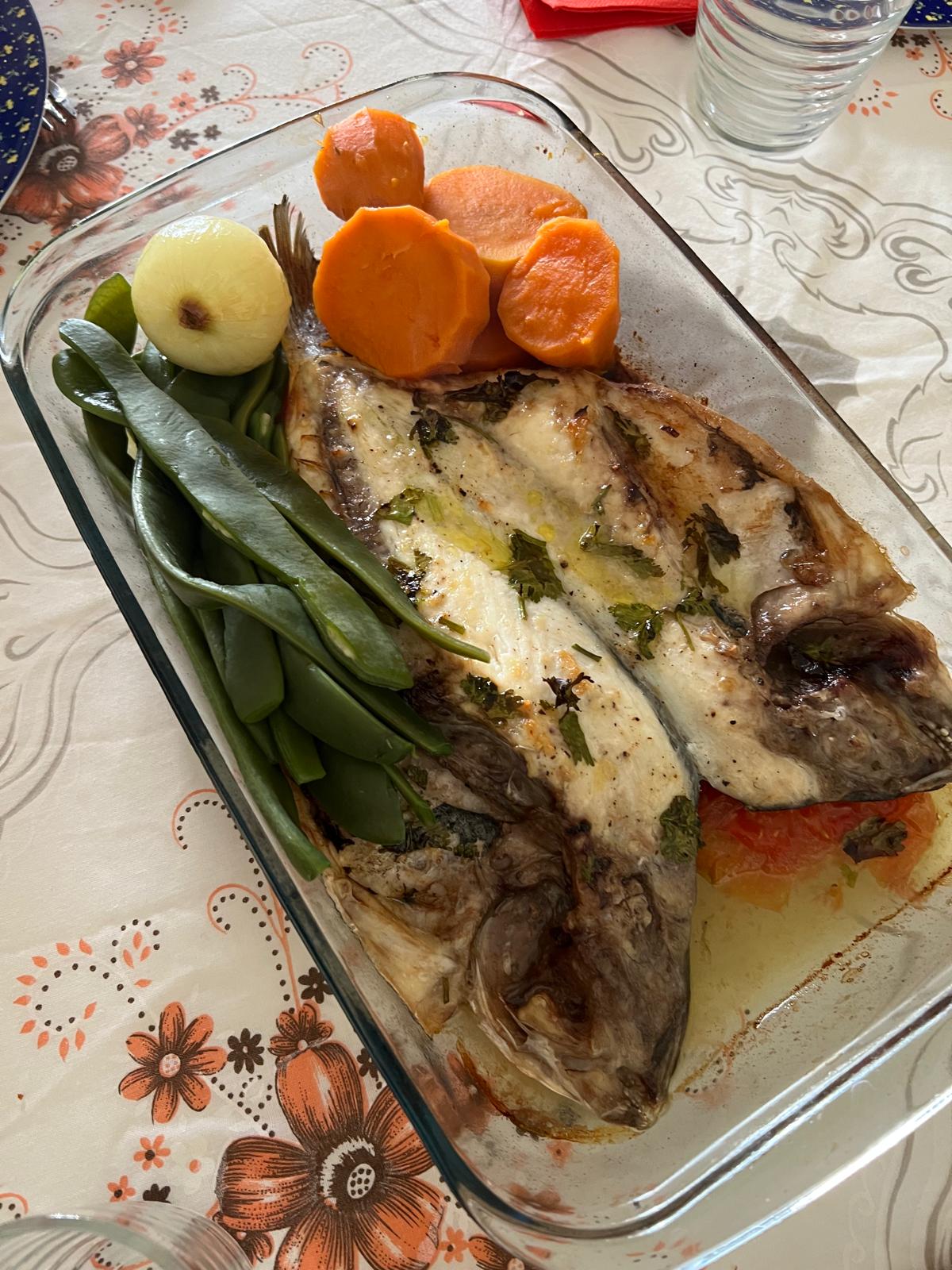 Dourada no forno acompanhada de batatas e feijão verde