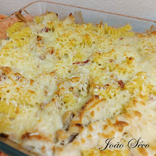 Delicie-se com esta massa gratinada, onde pedaços suculentos de frango e tiras de bacon se envolvem numa cremosa mistura de bechamel, temperada com noz-moscada. Gratinada até à perfeição, oferece uma crosta dourada e um interior irresistivelmente cremoso que satisfaz os paladares mais exigentes!