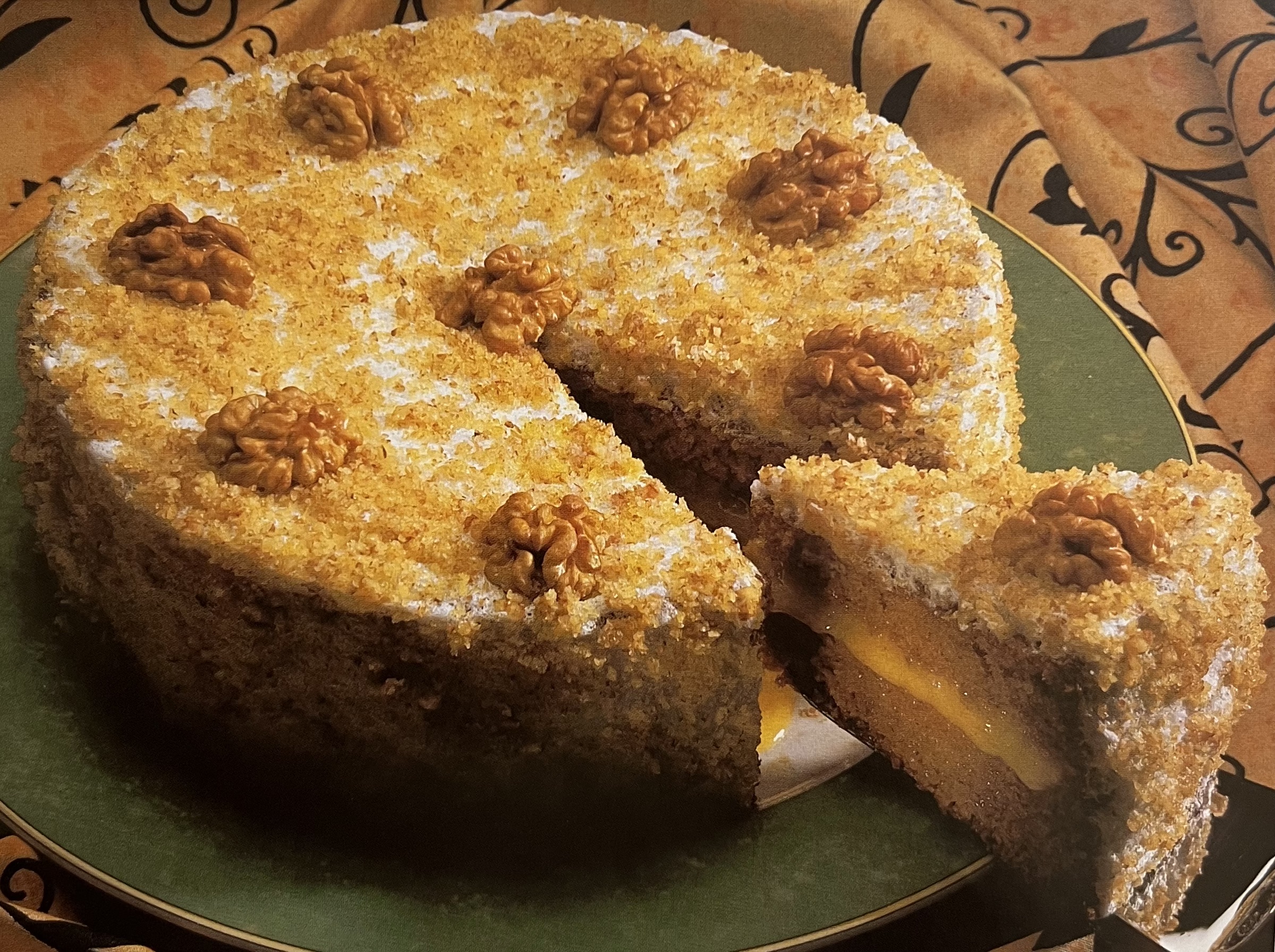 Bolo de nozes recheado com creme de côco e coberto com merengue