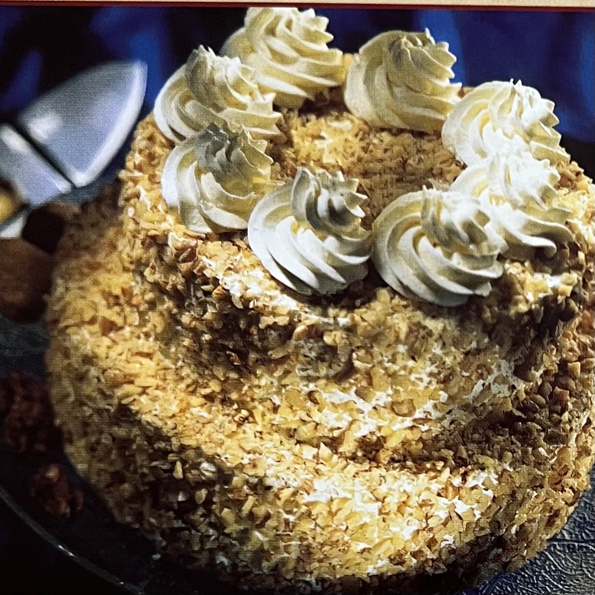 - Cubra o tampo do bolo menor com glacé e polvilhe-o, assim como a beirada que ficou entre os dois bolos, com o resto das nozes picadas. Encha uma seringa ou saco de confeiteiro, munido do bico canelado, com glacé e enfeite o bolo com uma guarnição de rosáceas.