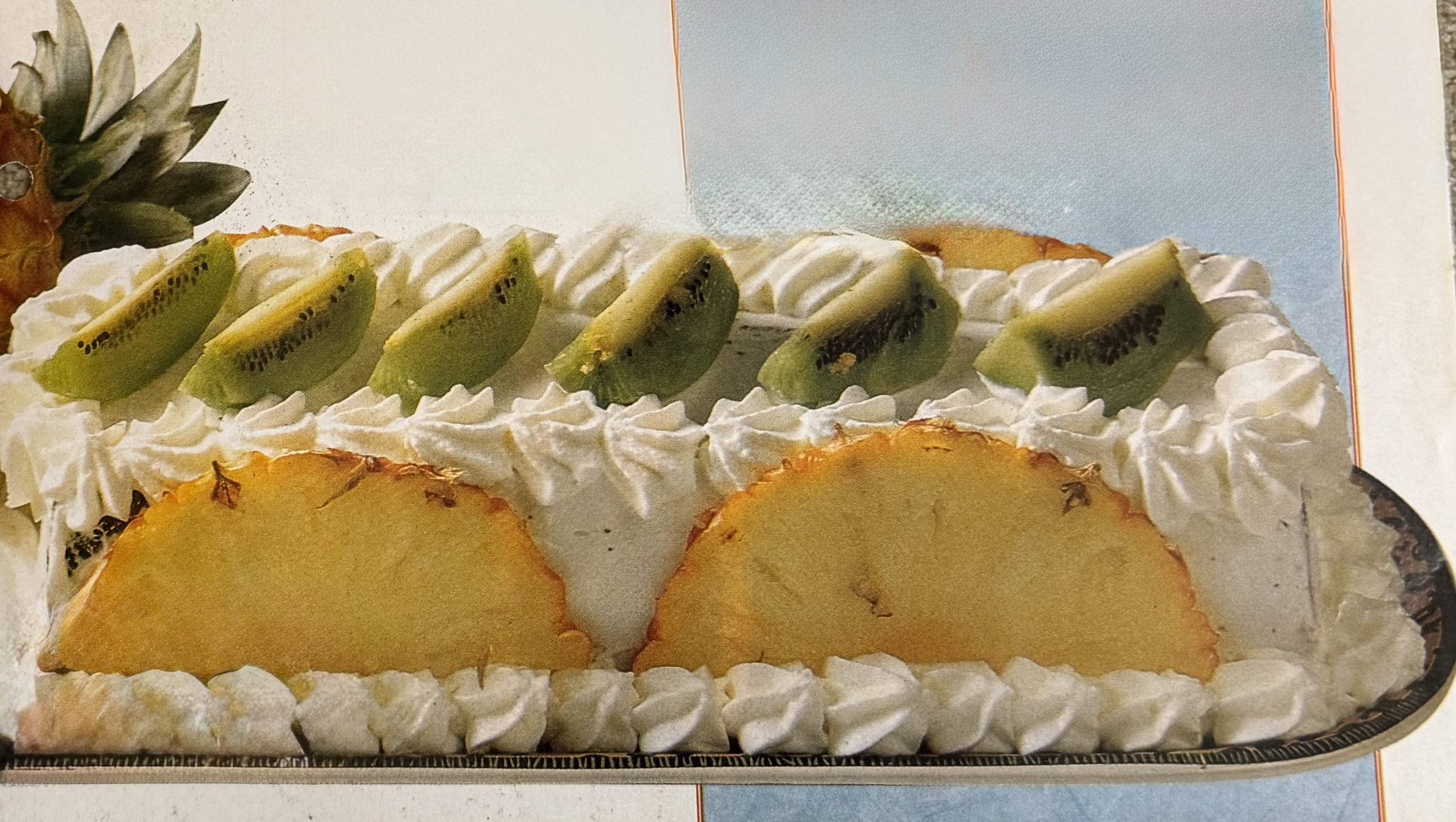 - Entretanto, bata as natas com o restante açúcar em chantilly. Corte o ananás em pedacinhos. Descasque os kiwis e a manga e corte-os também em pedacinhos.