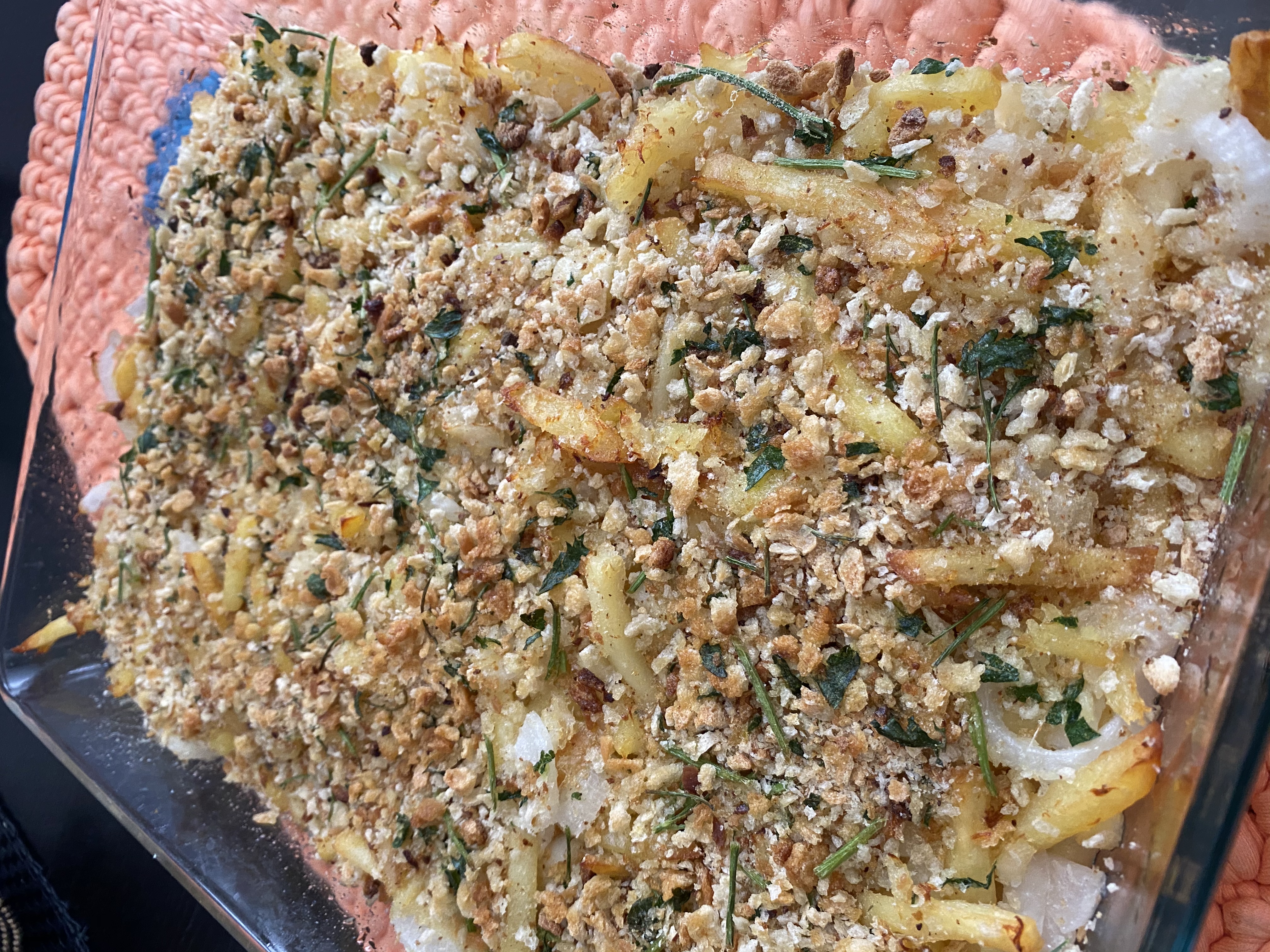 </p><p>Coloque tudo num recipiente de ir ao forno e polvilhe com uma mistura de pão ralado, salsa e alho, picado finamente, a gosto.