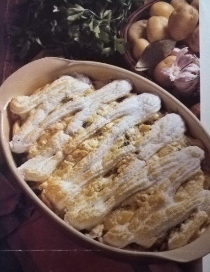 </p><p>Num tabuleiro de forno, coloque uma camada de batatas, disponha sobre ela uma camada de bacalhau com algumas azeitonas, e assim sucessivamente, até se acabarem os ingredientes.