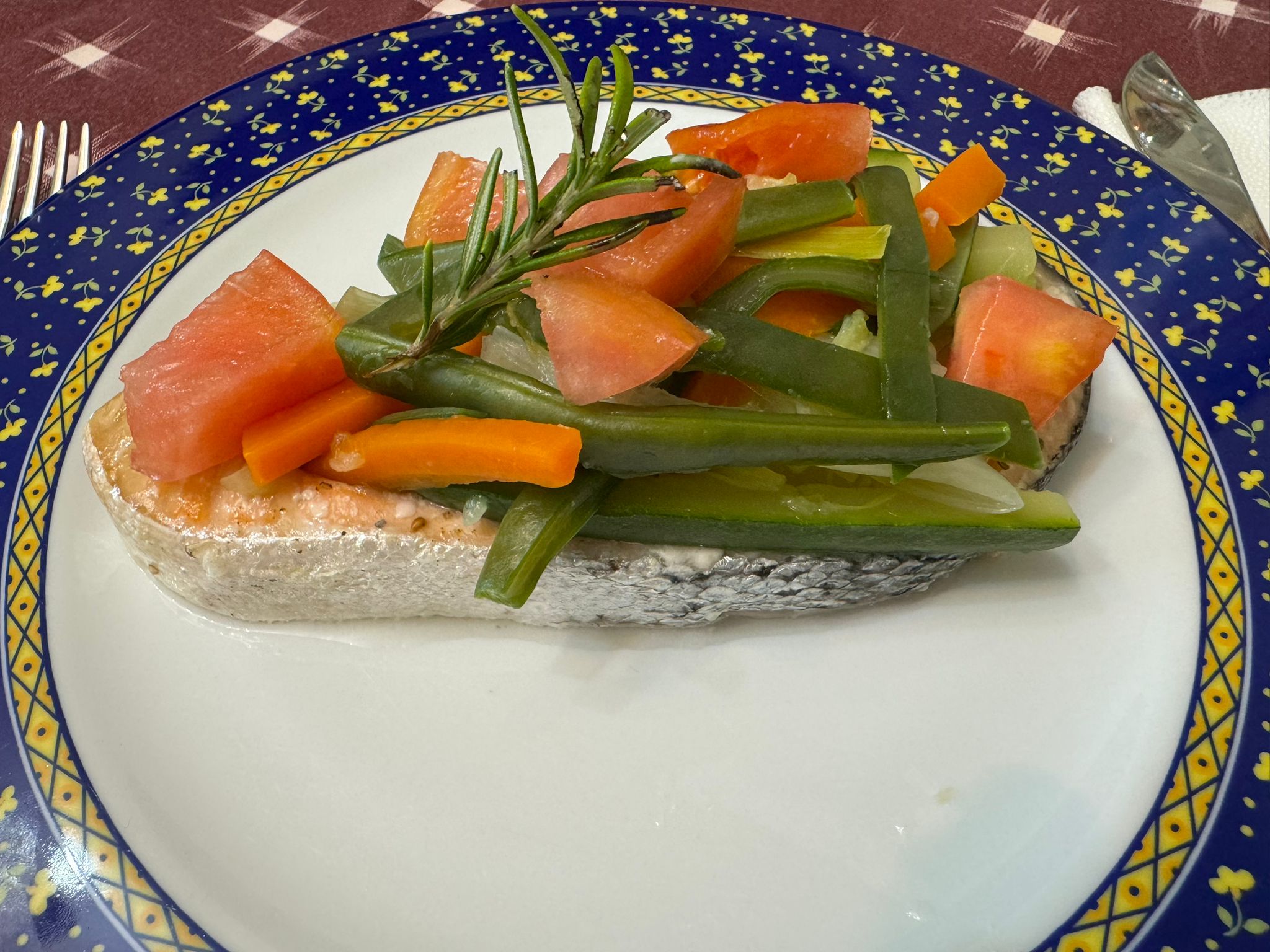 Coza os legumes em água fervente durante 8 minutos. Corte o tomate em pedaços pequenos, envolva-os com os legumes escorridos e coloque sobre as postas de salmão, que entretanto retirou do forno e regou como próprio molho. Sirva de seguida.