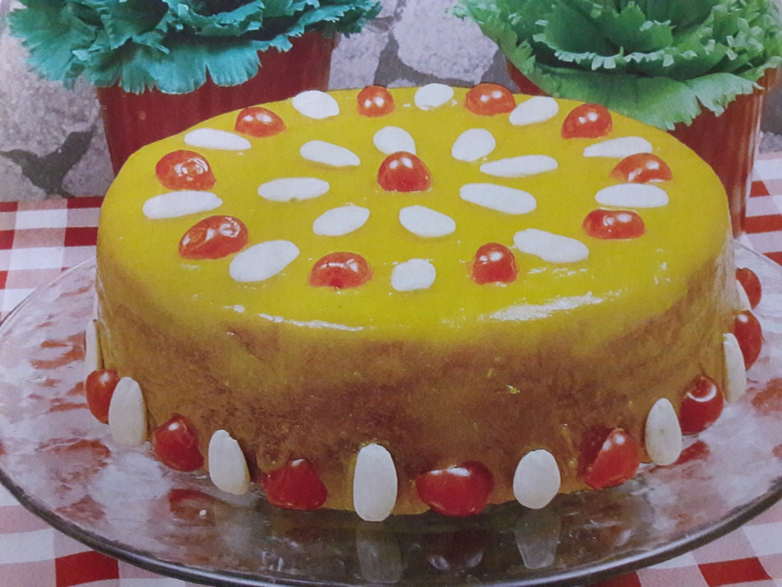 </p><p>Pincele bem o bolo com as gemas de ovos batidas, para dar brilho e enfeite com as cerejas e as amêndoas.</p>