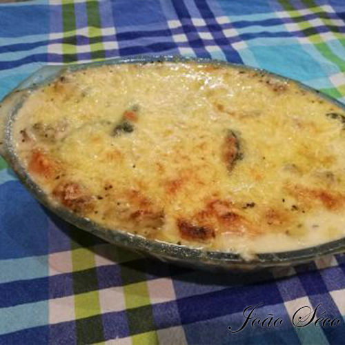 </p><p>Coloque tudo numa tarteira de ceramica. Regue com o molho Bechamel, polvilhe com queijo parmesao ralado e leve ao forno para gratinar,</p>
