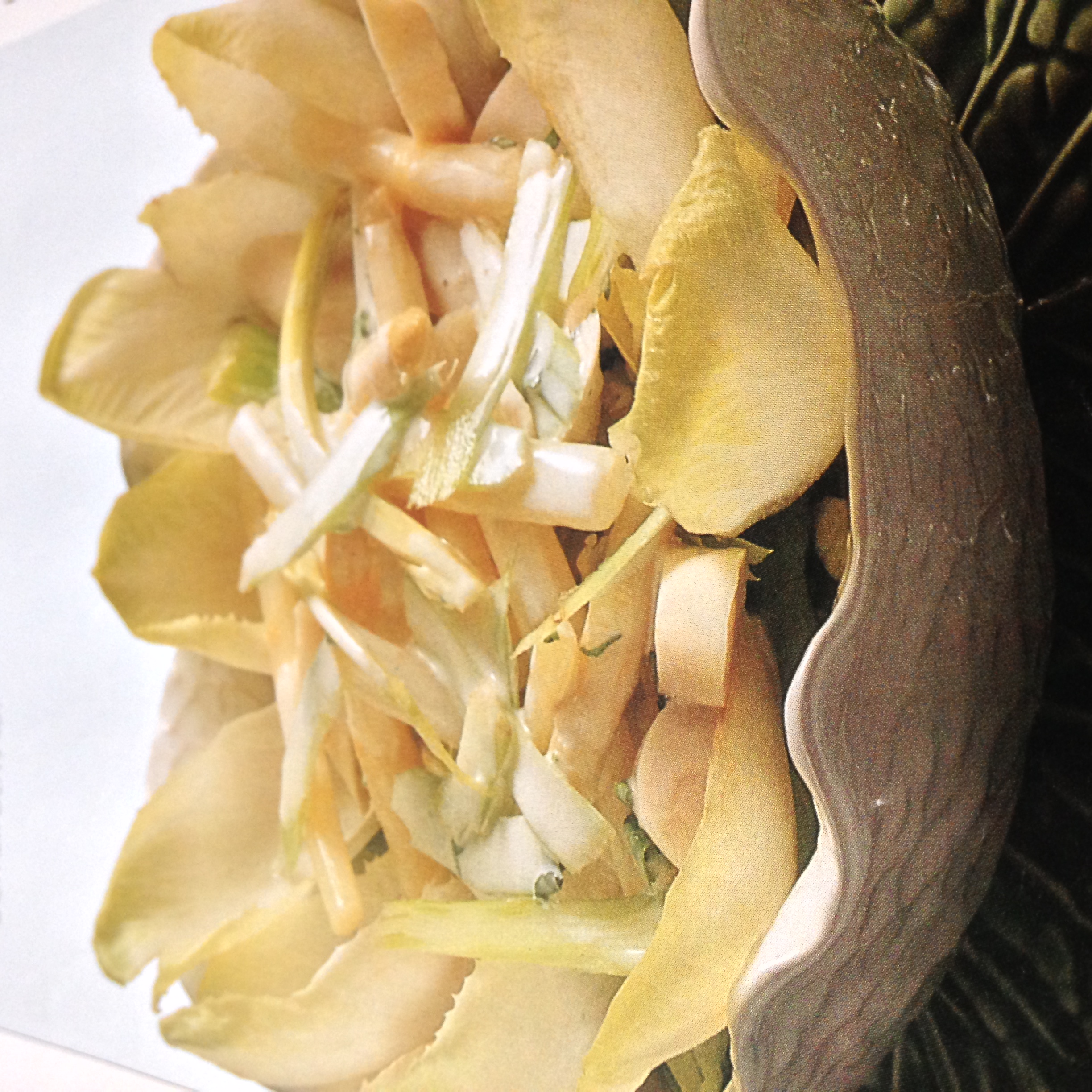 </p><p>Num prato redondo, disponha as folhas de endívias, os espargos, os palmitos e, ao centro, o aipo e as bolas de melão.