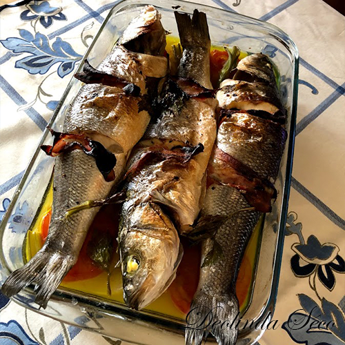 </p><p>Por cima, coloque os robalos e termine com folhas de apoio.