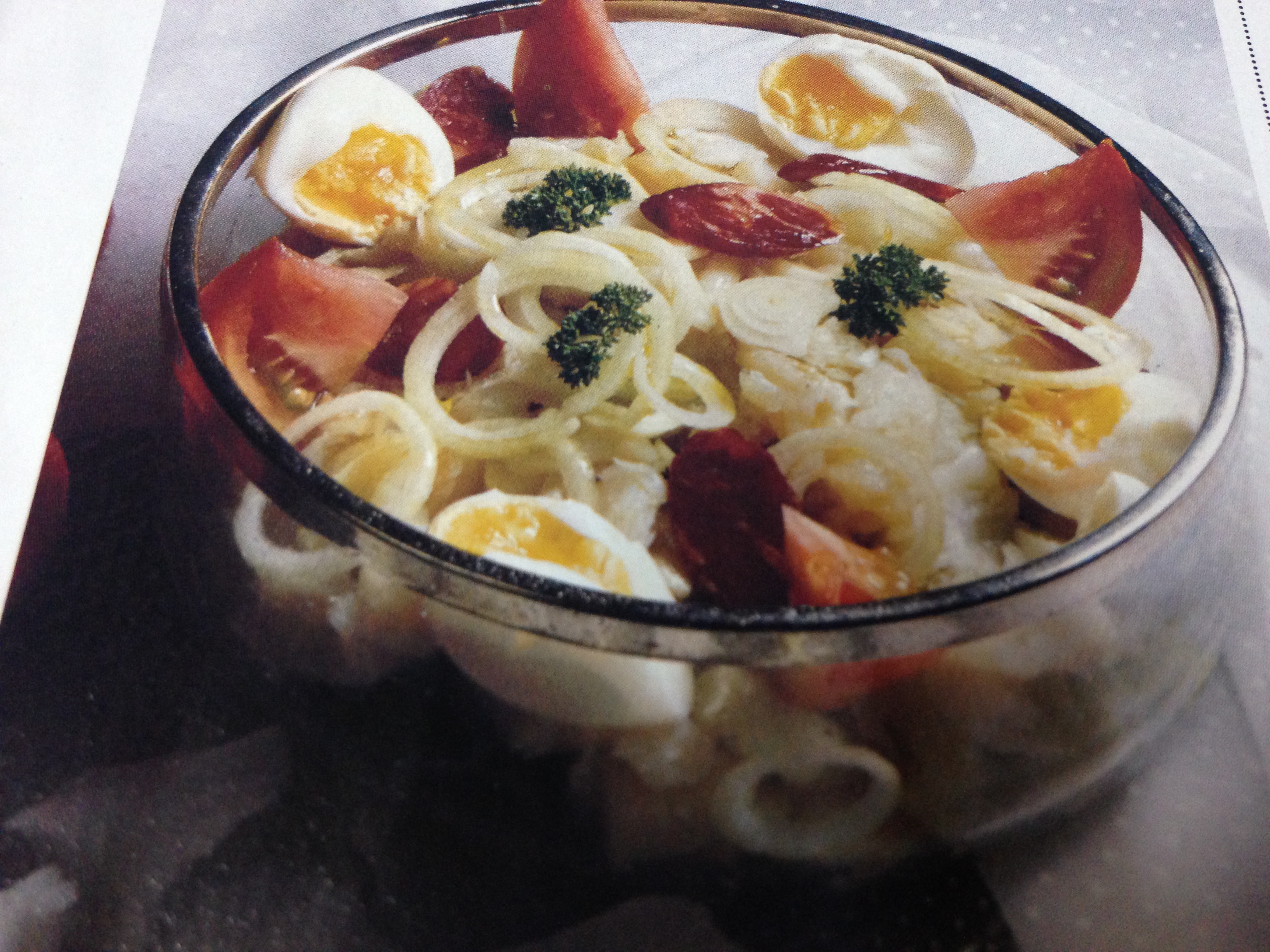 </p><p>Numa saladeira, misture o bacalhau com as batatas aos cubinhos, a cebola em rodelas, a salsa e os alhos picados.